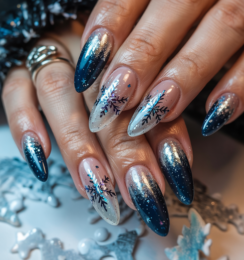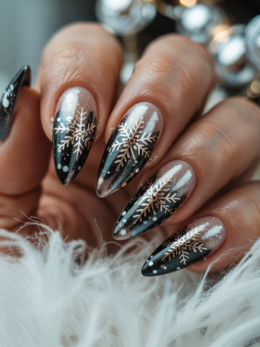 This manicure is a walk into a cold night with shimmering lights. The use of black and silver gradients makes the background dramatic and the golden snowflakes of different complexity and makes each nail a small masterpiece. It is the ideal combination of daring and elegant.