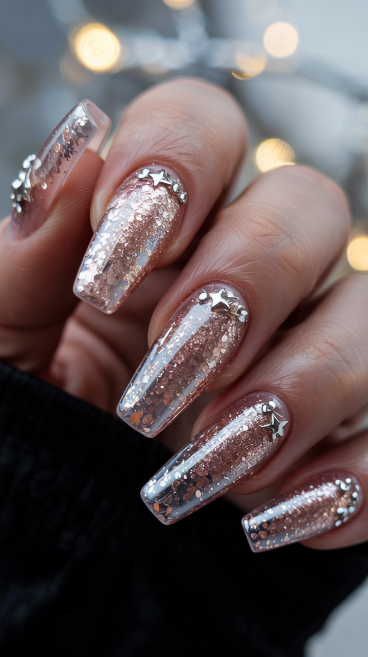 Rose gold glitter will always have a solution when you feel like getting nails that are almost screaming celebration. Dipped in sparkle and crowned with silver star decorations, these square extensions have a cosmic, almost champagne-like appearance. They are audacious, partying and cannot pass unnoticed with flickering holiday lights.