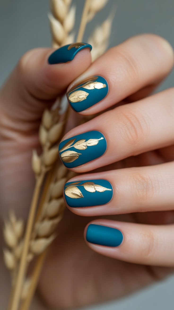 These nails are luxurious, gloomy and seasonal in character. The matte teal background is modern and earthy, and the golden leaf accents provide the necessary feel of luxe. It is a design that warms up winter, and reminds you of the silent beauty of nature even at the very coldest months.