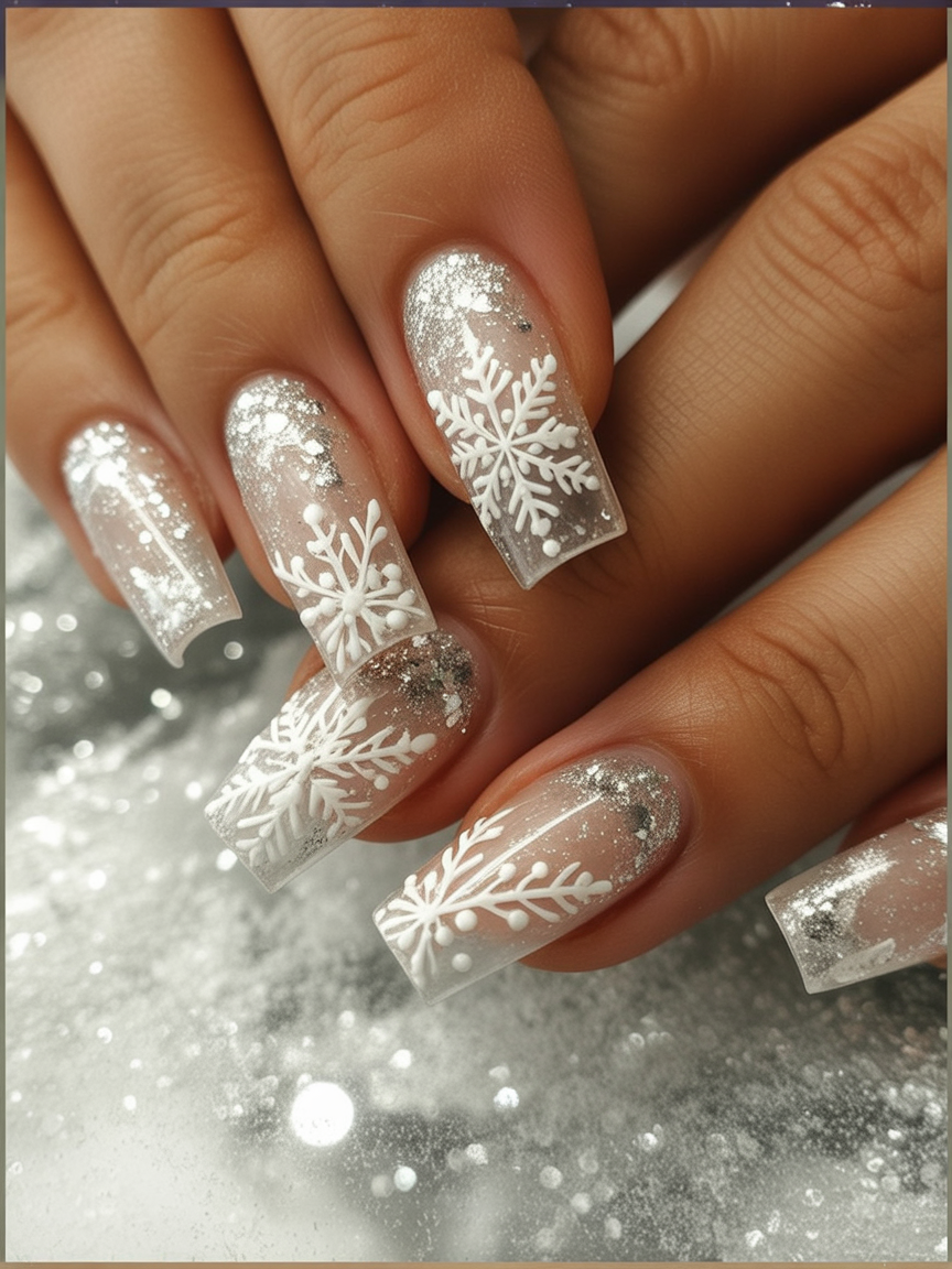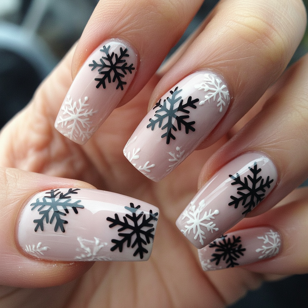 Minimalists, celebrate–this ensemble transforms the neutral sounds into something really magical. Nude soft nails are the ideal canvas on which to lay a big black and white snowflake, which gives contrast and seasonality without being overwhelming. It is easy, elegant, and makes you remember that the most noticeable things are not always loud.