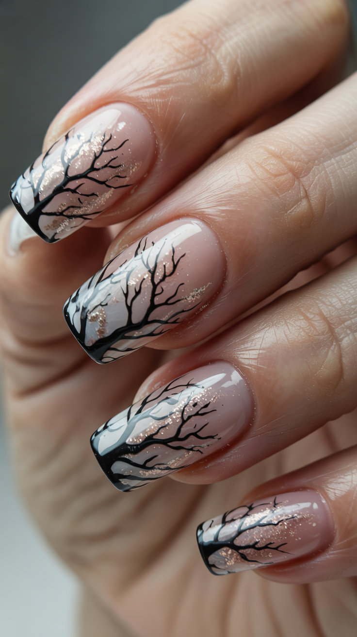 Bare winter trees are hauntingly beautiful and these nails perfectly reflect this. Against a smooth nude foundation with a hint of shimmer, black branches are spread over each end like a dainty painting. It is dark, creative and subdued.