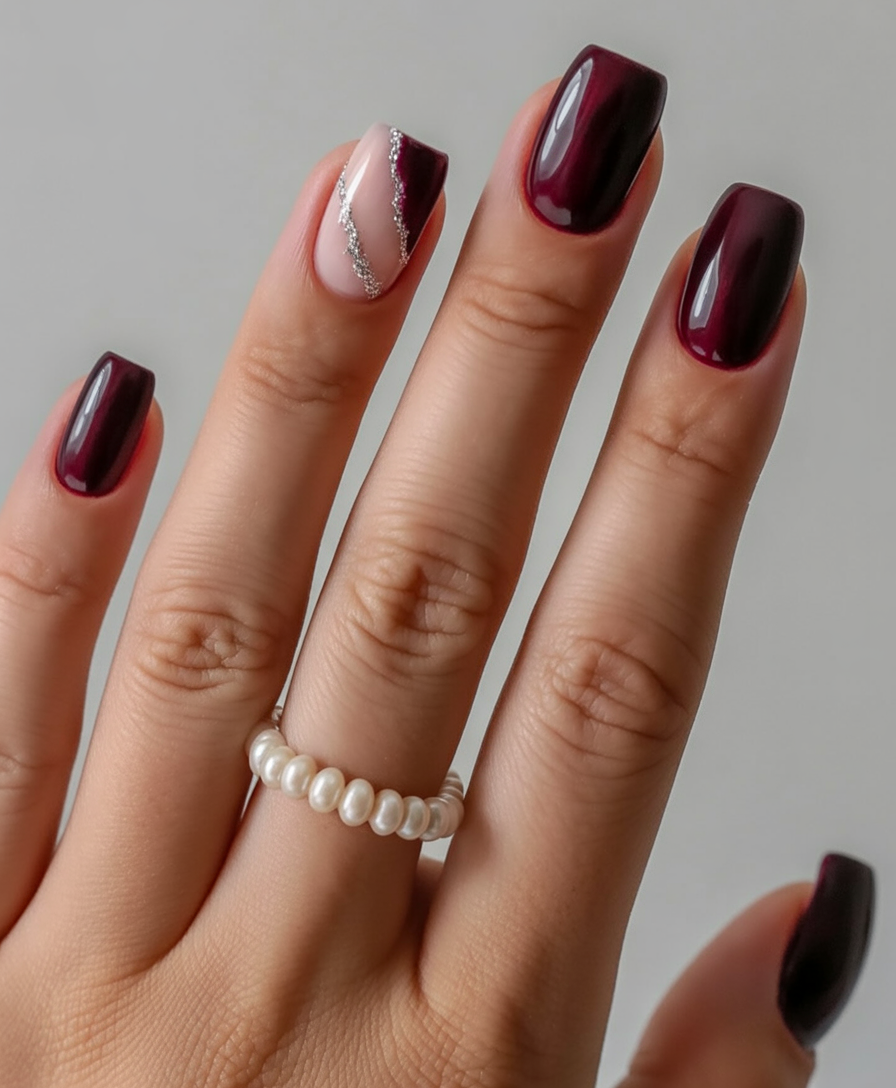 Cozy sophistication is dark burgundy nails, but in this case, they are given a fun twist with one accent nail. The silver glitter-lined soft blush base is like jewelry on your fingertips- subtle, yet noticeable. It is fashionable, contemporary and an effortless method of enhancing a classic shade.