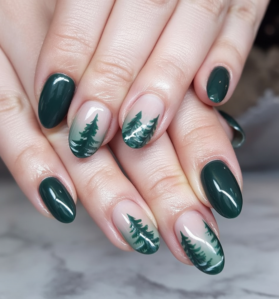 This appearance is ideal in case you adore green ideas that border on natural inspirations. It fits well on almond or stiletto shapes and the flair gives it an additional specialness but does not overpower the design. This is a gorgeous compromise between the earthy and the glamorous, and, as a person who loves earthy tones yet still desires a bit of christmas glam, the middle ground is truly gorgeous and can be worn all season.