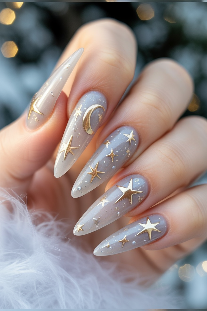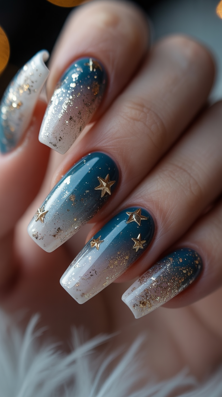 This look is ideal on long square nails, and is perfect to women who admire designs with a touch of heavenly inspirations. The gradient causes nails to appear long and the metallic stars add fun factor. It is a beautiful option when you are going towards winter solstice themes, but you want something that can be used beyond the holidays.