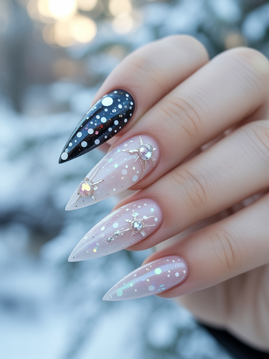 This manicure is winter in two flavors: the silent whiteness of snow and the glittering black sky full of stars. It is glittering without being ostentatious with rhinestone accents making constellations. A nail has its little story.