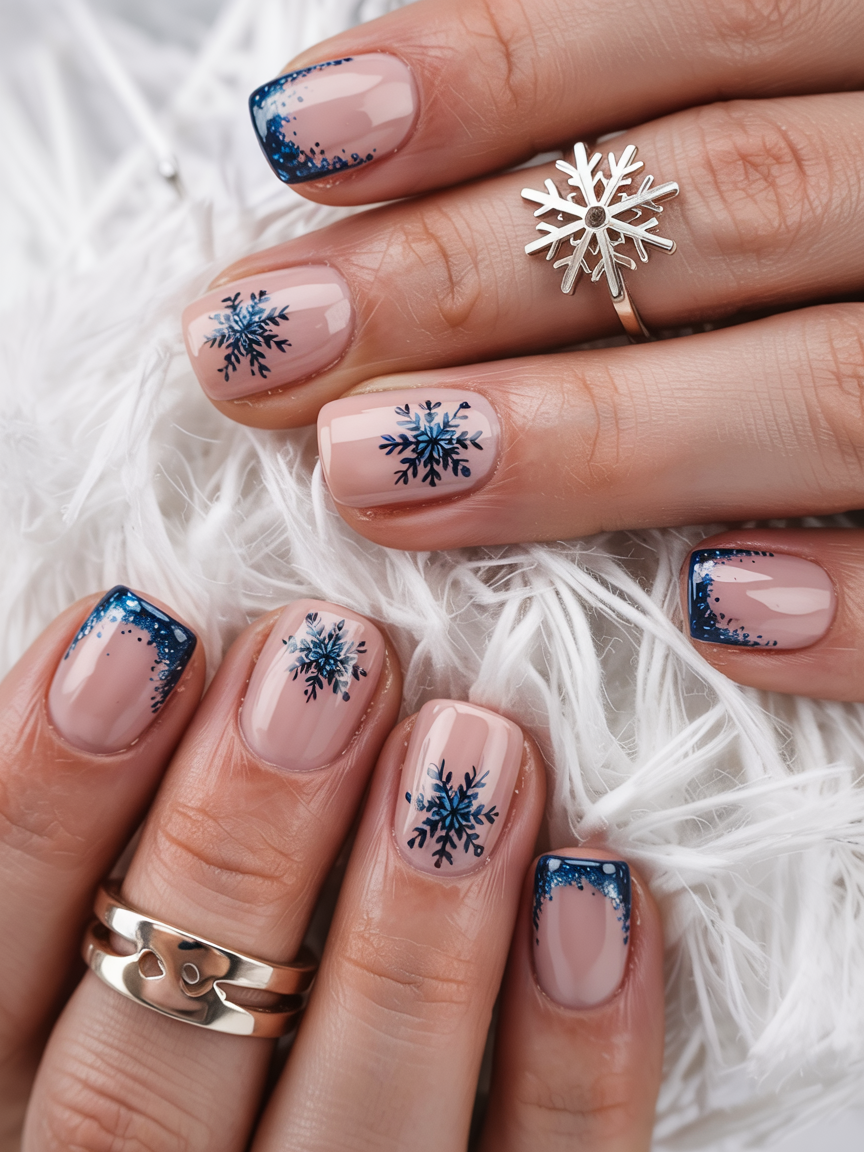 Classic French tips are given a cold upgrade with blue glitter edges and little snowflake patterns. Combined with a naked base, the style is clean, flirtatious, and immediately celebratory. It is a jovial method of adding winter glitz to shorter nails.