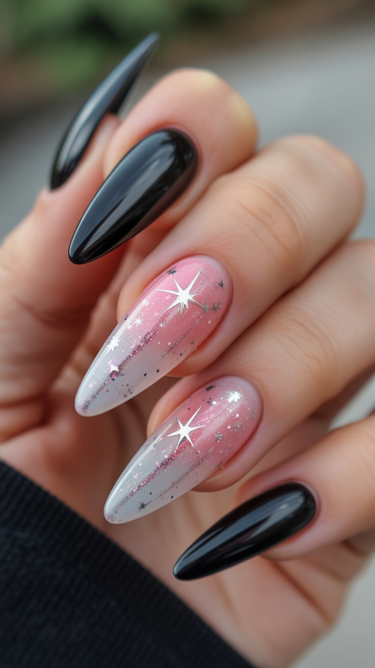The gradient of a dreamy light that passes through soft pink to silvery grey with the sprinkling of white stars gives a heavenly but feminine effect. Combined with hard glossy black nails, the contrast is impressive and this manicure has an edgy touch.