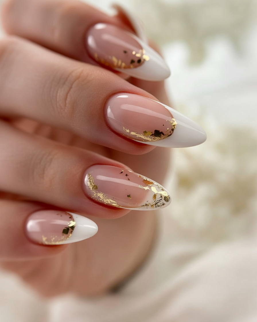 It has a vintage quality to a French tip when it’s rediscovered with a holiday flair. Such almond nails to play with soft pink, crisp white and delicate flecks of gold that are like bubbles of champagne trapped in polish. It is glamorous but not loud and ideal in case you like a touch of glamour but it does not take the center stage.