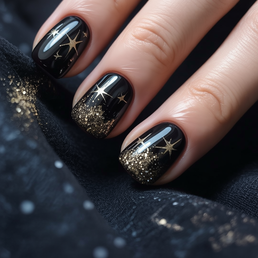 These nails resemble the night sky painted in polish- inky black with golden starbursts and glowing gradations that are mysterious and glamorous. They speak grace with dramatic flair, the type of design that you wish to take a sip of mulled wine around fairy lights.