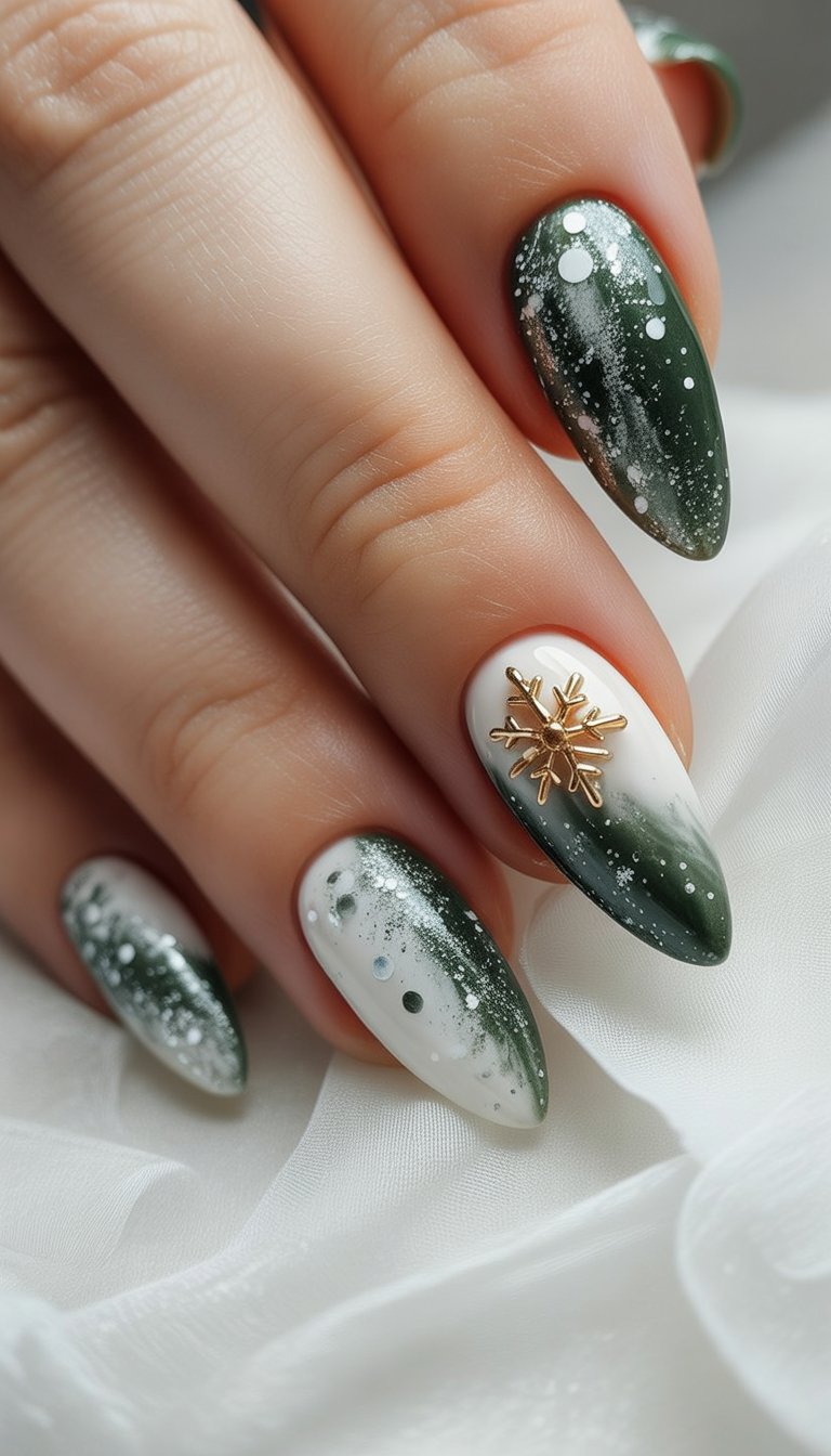 It is a manicure that is a walk through a snow-dusted forest rich green ombré fades to crisp white with falling snow specks and a golden snowflake charm. It is a celebration but not corny, and it has that warm, winter feel the solstice always has.