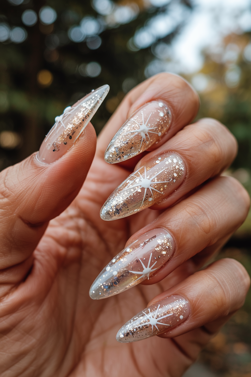 Had winter got its own firework show, it would appear like this. These acrylic nails are clear, filled with silver glitter and small white starbursts, which flashes the light with each movement. They shine without being weighty, and they have that icy-fresh glamour that you want in holiday evenings.