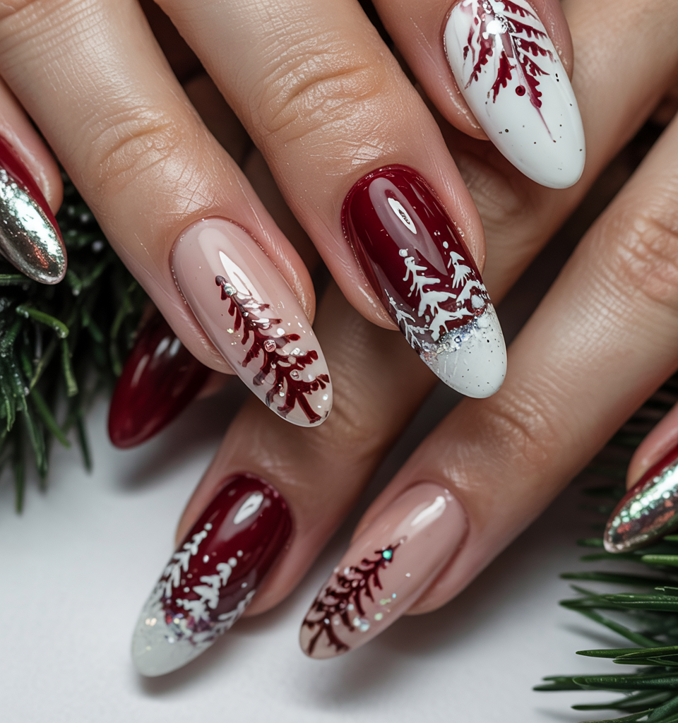 There is hardly a design that embodies christmas spirit as well as this one does. The red colors are bold, nude and crisp white are combined, and each nail has a tiny pine tree silhouette dusted with glitter. The impact is celebratory but classy as a holiday card that comes to life in your fingertips.