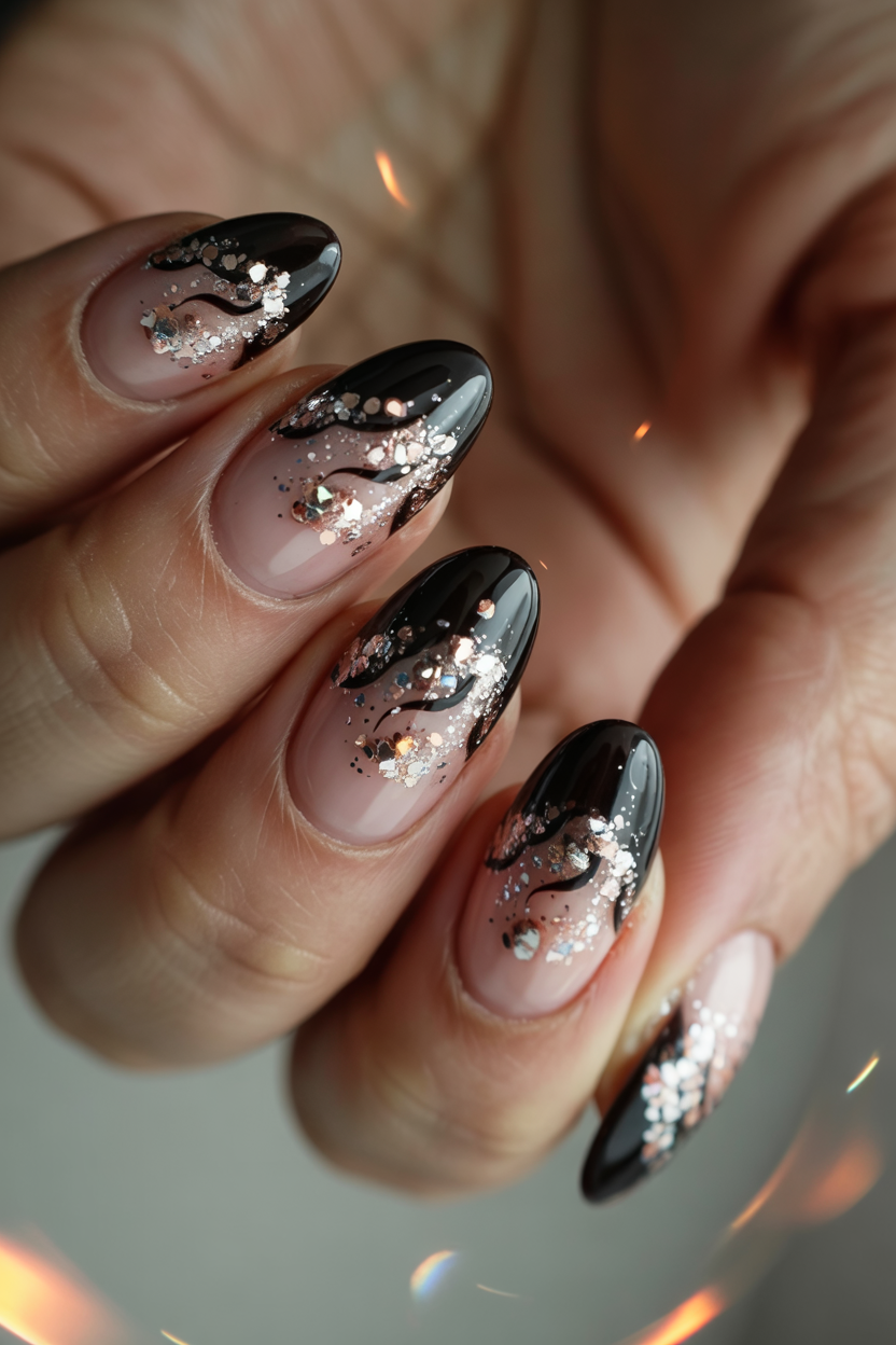 These nails are made with glossy black ends and swirling glitter and shimmering sequins, bringing out a dynamic and festive effect. This set is glamorous but not too heavy as the contrast of nude base and bold details is made. It is the ideal manicure to a party during holiday or New Year.