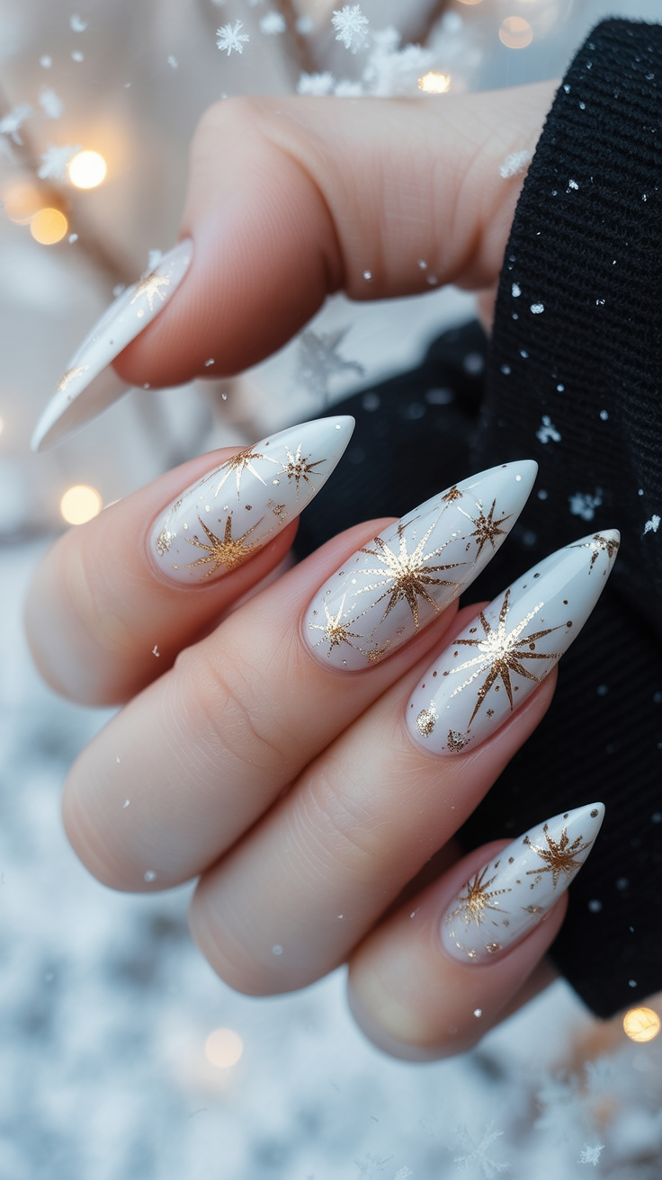 White nails are bright and crisp, and the golden star bursts shine on it, and this design is filled with holiday cheer. The appearance is bright, dramatic and reminds of glowing lights on snowy heavens. It is plain in design and strong in effect.
