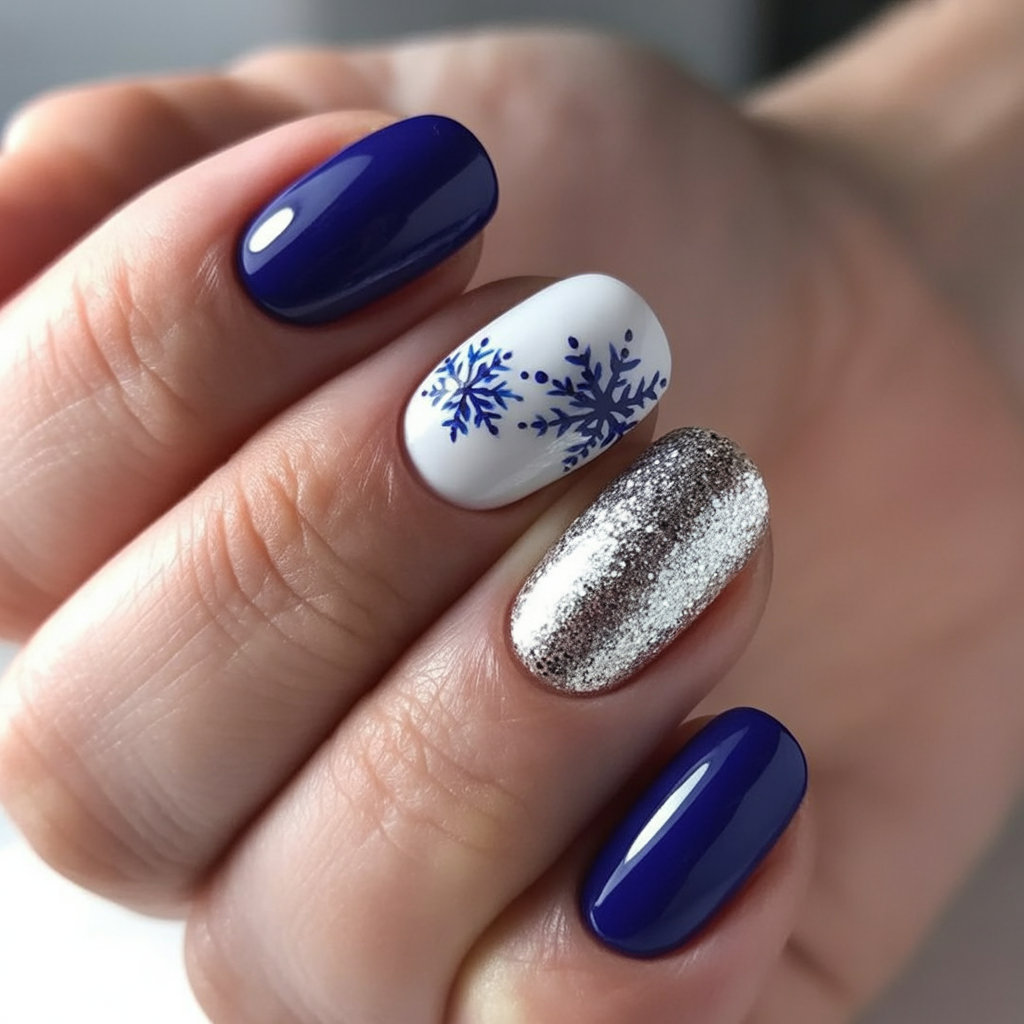 This design fuses different navy tones with icy accents in a visibly bold yet refined manner. The alternating snowflake art and sparkly nails keep the attention while remaining unified. It is a striking way to contrast without going too crazy.