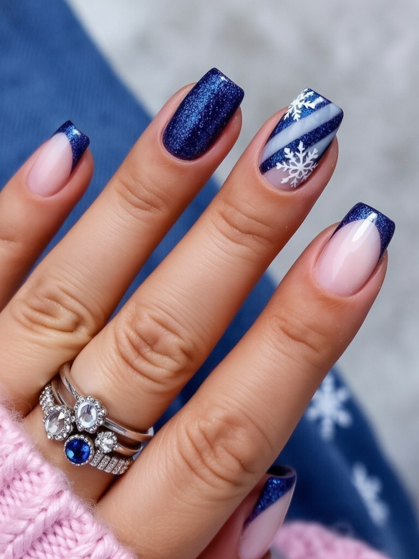 There’s a playful charm in these striped navy nails that instantly makes you think of wrapped winter gifts. The shimmering dark blue is rich and festive, while the snowflake designs add that extra touch of seasonal magic. It’s the kind of nail art that whispers holiday cheer without going overboard.