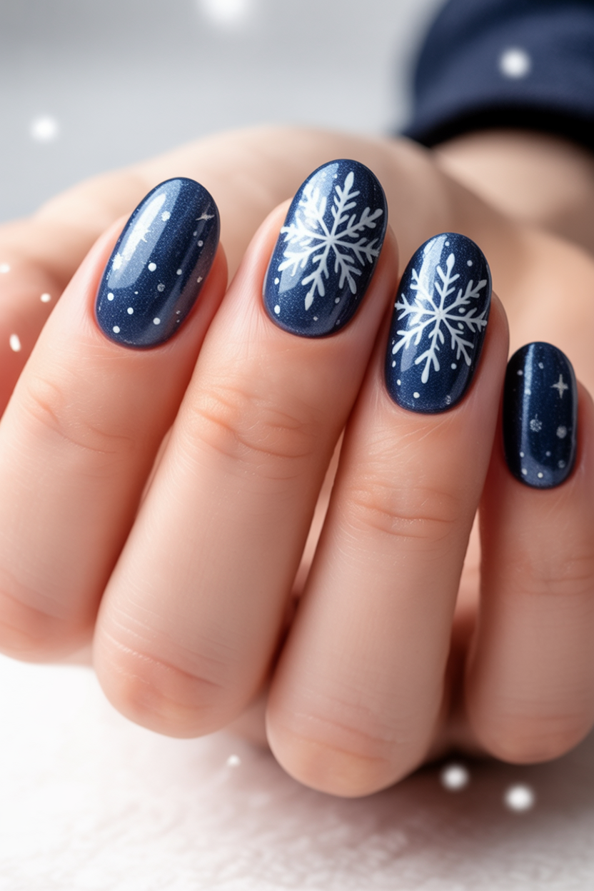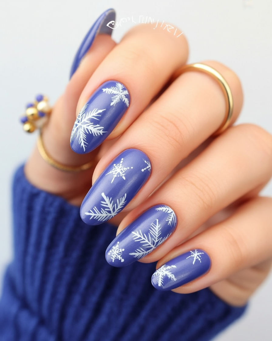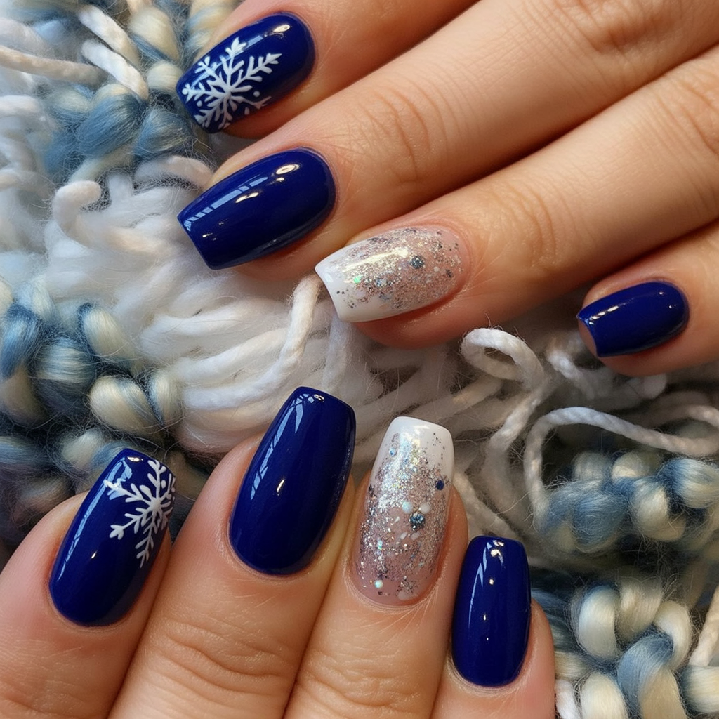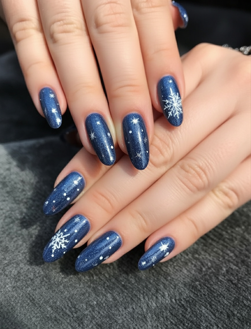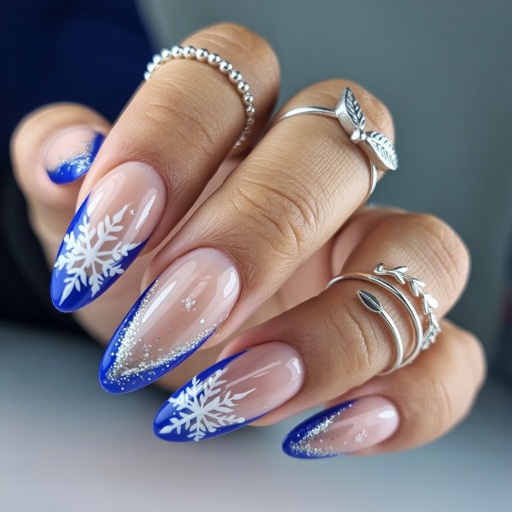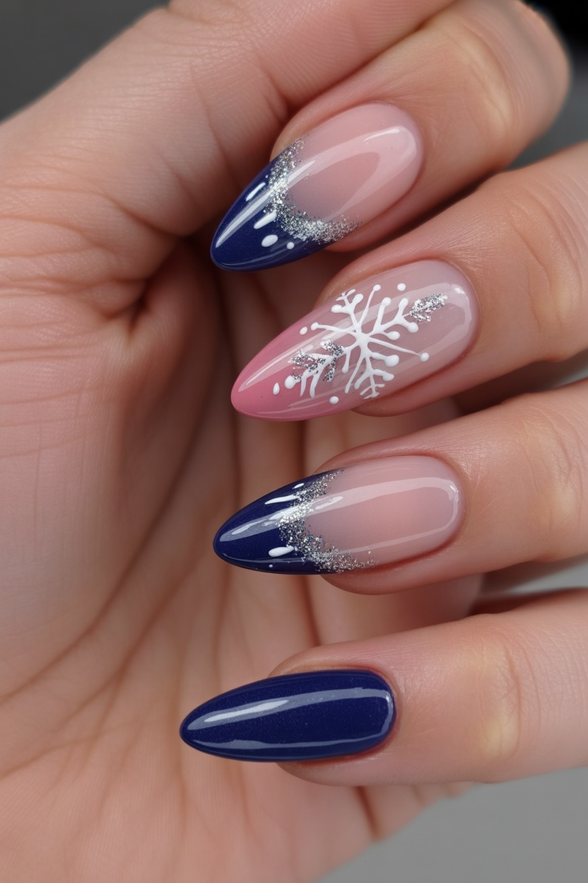 This combines solid navy with glitter accents and delicate snowflakes for a balanced winter look. It is the kind of design that reminds you of cozy nights wrapping yourself in a blanket with a hot mug of cocoa. The almond shape keeps it soft and feminine, while the mixture of textures keeps it interesting. A great choice if you want a manicure that feels versatile and festive.