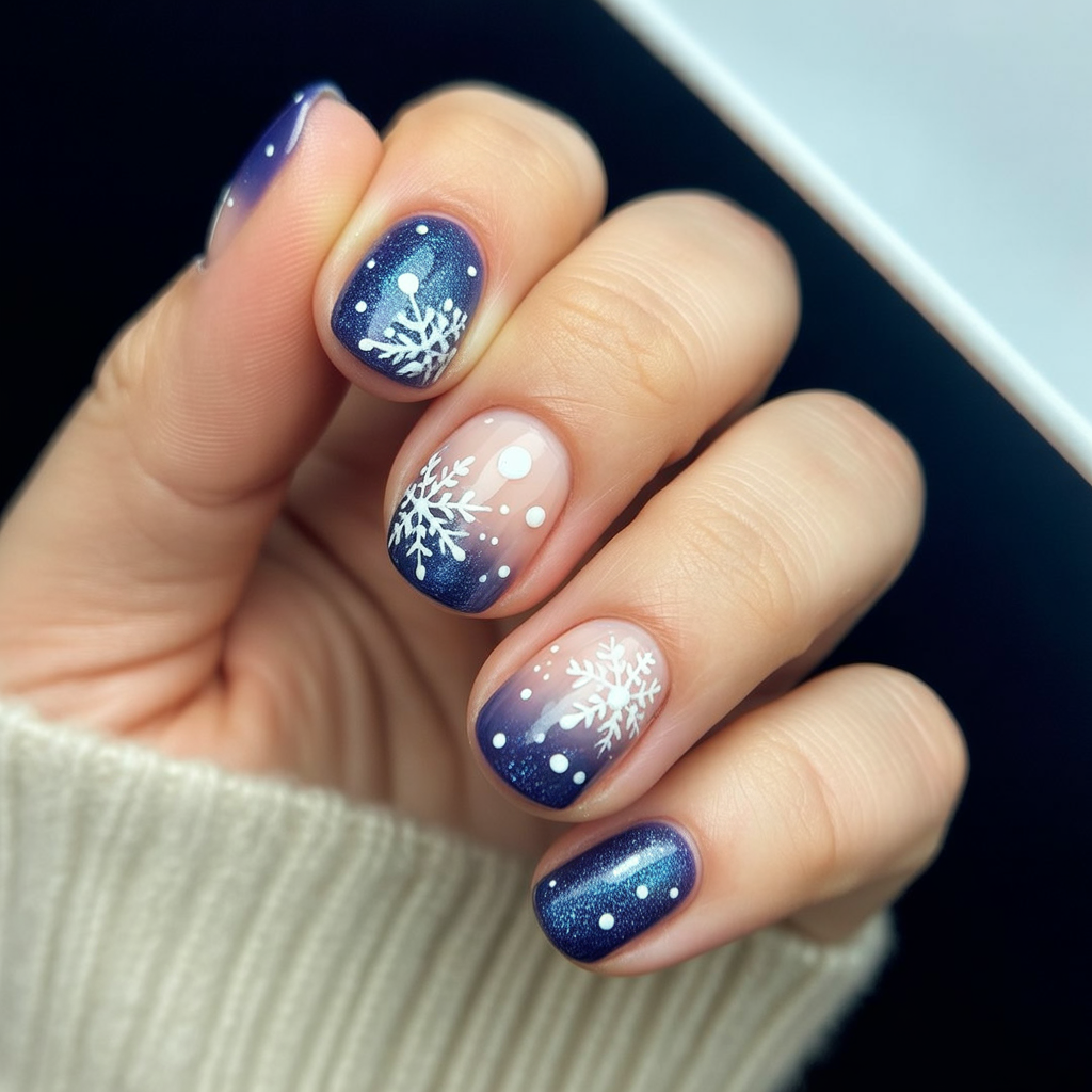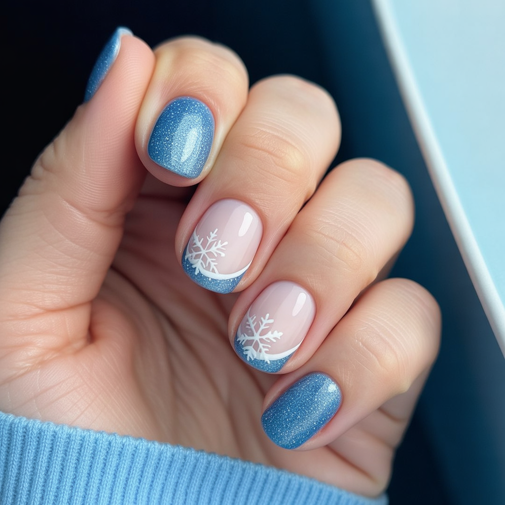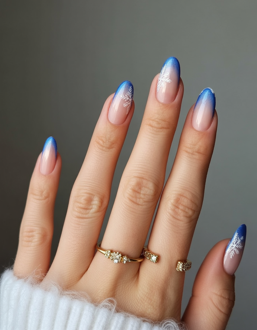Soft ombre tips in icy blue with delicate snowflakes create a feminine, frosty look. It’s understated yet festive, the kind of design that works whether you’re at a casual gathering or New Year’s dinner.