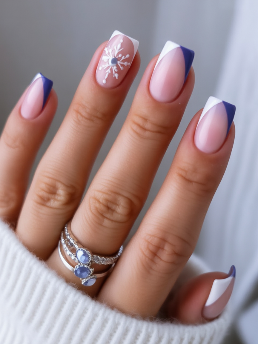 A modern French manicure with ice navy tips and delicate snowflake accents gives you a style that feels at once both traditional and fresh. The pale base keeps it light and wintry, while the angled blue tips add an unexpected little bite.