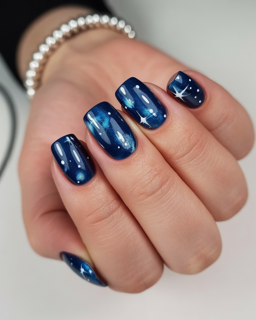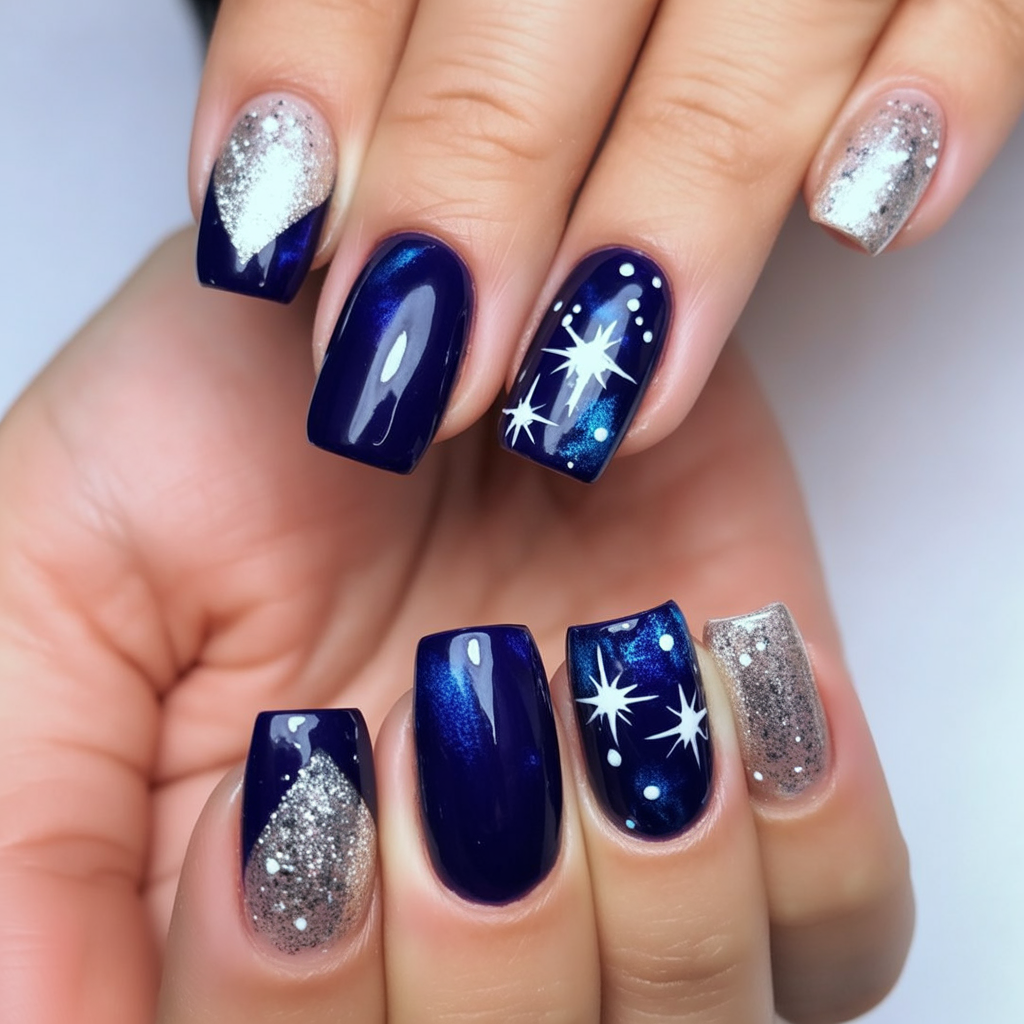 These nails are like a shimmering piece of art. The bold navy glitter lines frame natural nail beds, while subtle snowflakes and dotted details give it a whole lot of depth and whimsy. It is glamour that does not go overboard, just perfect for a girl who wants just enough sparkle with class.