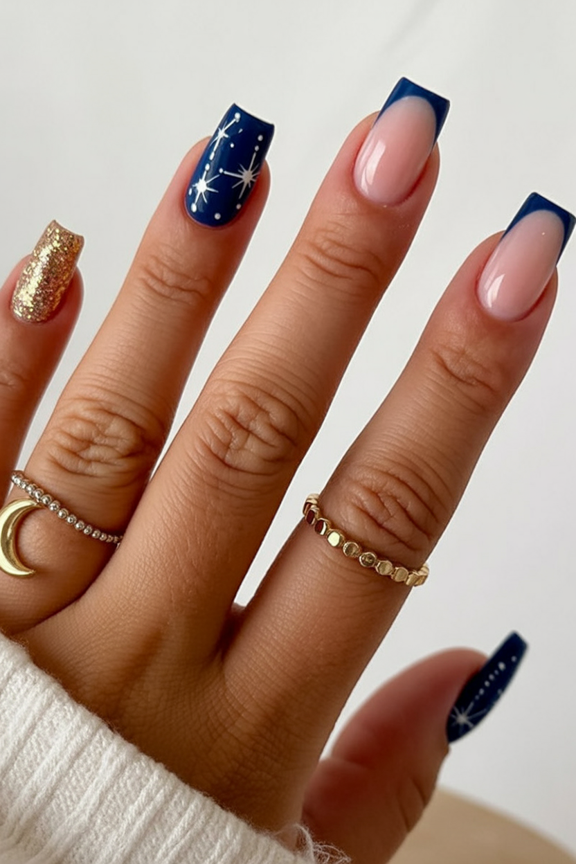 Midnight blue with dot-like star bursts — these nails represent a clear, frosty evening sky. The nails and the single glittery gold accent combine for an effect that is dreamy and festive, like a glimmering ornament on dark branches.