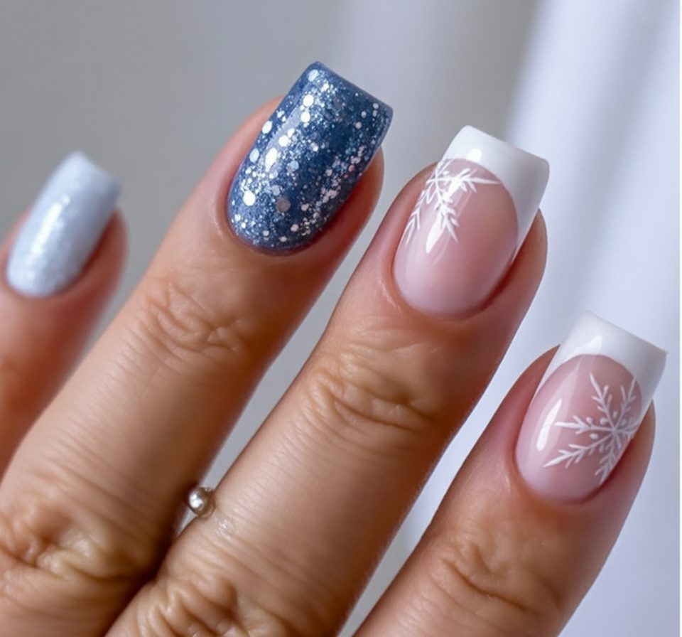 Deep navy paired with chilly white snowflakes feels like catching glimpses of the northern lights across a clear sky. The tiny sparkly flecks give this set an enchanting, otherworldly glow — the kind of manicure that makes you pause just to admire your hands.