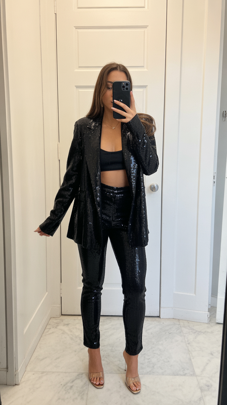 The trick that will make this outfit shine in 2025 is that it reflects the trends of the present day – combining traditional tailoring with glitzy materials. It is particularly effective when it comes to women who enjoy a more structured shape and yet enjoy that festive shine. Wear it with bare toes to make your legs look longer or change to strappy metallic sandals to give it a bit more vigor. In any case, it is a stylish decision that will be comfortable to wear as it is to look at.