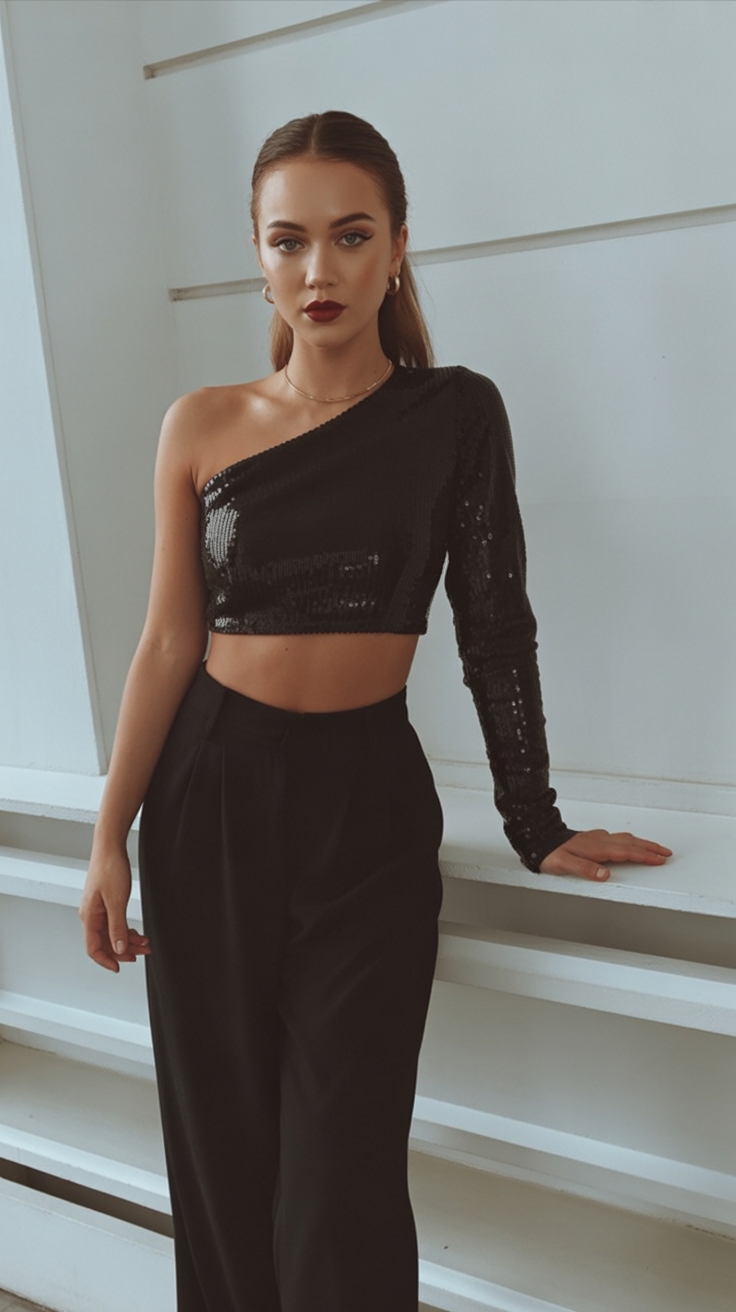 The one-shoulder sequin crop with black trousers is bare but impactful; it is all about balance. The asymmetrical neckline attracts the eye upwards and the wide-leg trousers stabilize the entire outfit, producing a fashionable combination of drama and polish. It is an ideal option when you want to do things in a simple way and still make an impression.