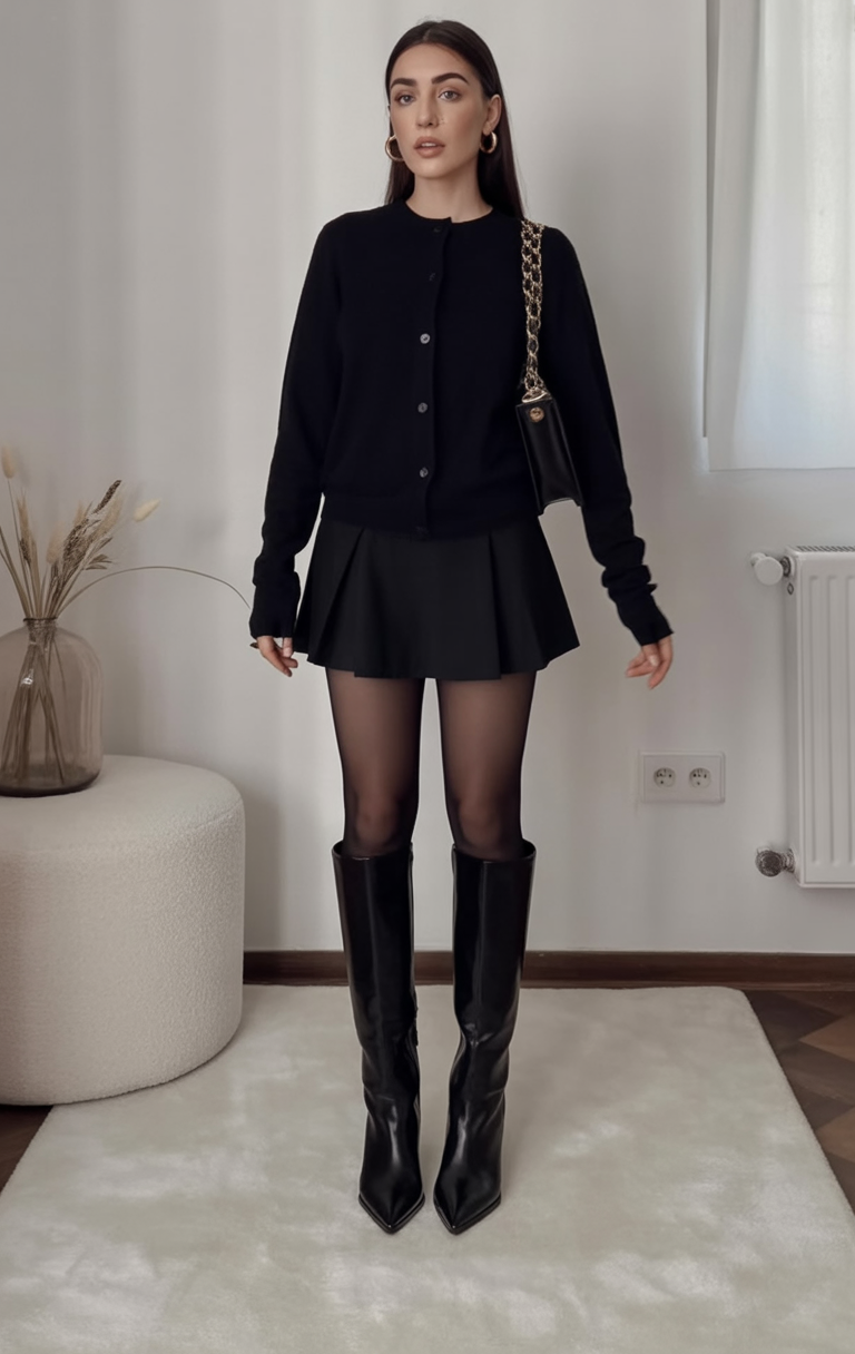 The simplest sometimes is the best statement. Sloppy cardigan fitted into a pleated mini-skirt, topped by high-heeled pointed-toe shoes, makes a neat and strong figure. Something about it is striking in its simplicity–there is no glitter, no shimmer, no sequins–just that silent assertiveness of a woman who understands that being unobtrusive can be memorable. It is the type of clothing that is casual enough to wear at a home party yet classy enough to wear at a fancy bar.