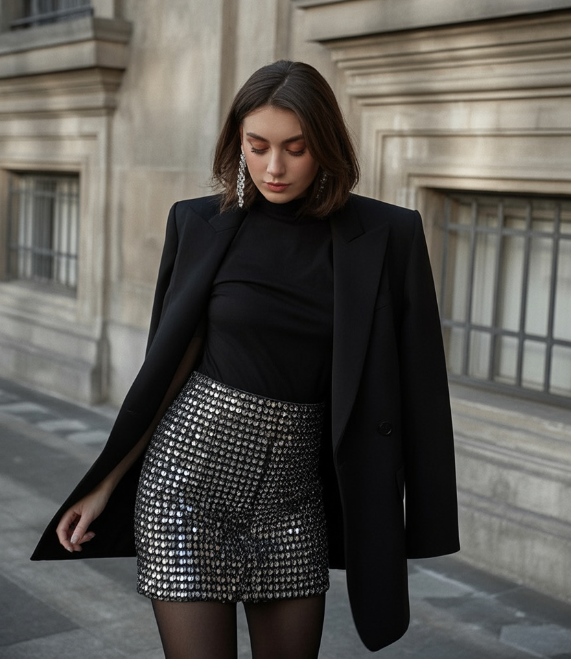 Something cannot resist the combination of sparkle and structure. A mini skirt which flashes with light with each stride, matched by the tailored crispness of a black blazer, is the ultimate combination of fun and sophistication. It is the type of appearance that makes you desire to enter a room where everyone will see your confidence first. The little glam details, such as oversized earrings, add that elegant night vibe to the entire outfit without being too obnoxious. It is smooth, contemporary and unignorable.