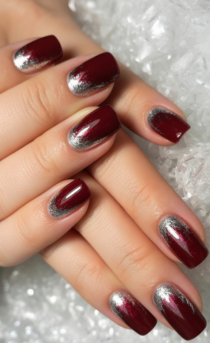This design fades from burgundy to a soft silver, making it look frosted. This nail design has both a cool and elegant look that resembles moonlight falling on red nail polish, making it look pretty feminine and modern.
