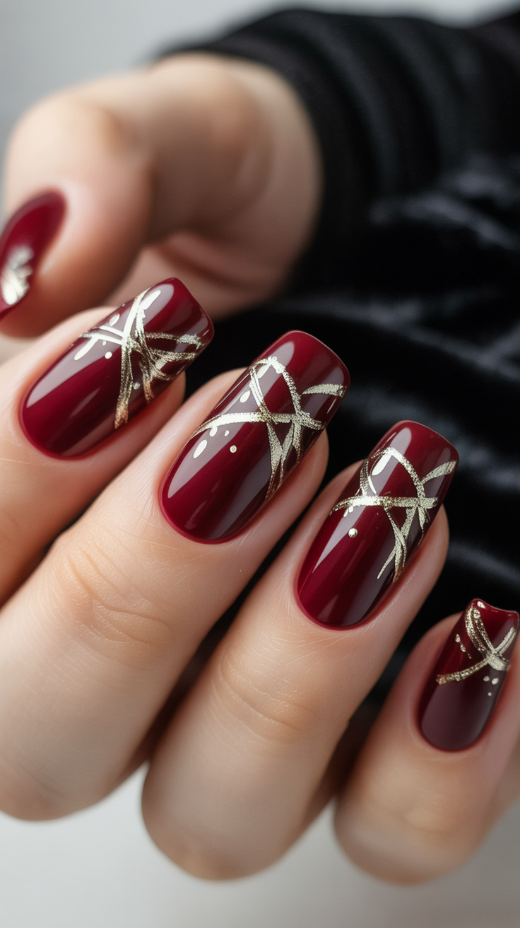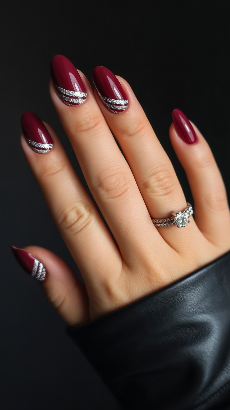These dark burgundy nails feature subtle diagonal gold lines—a minimalist design that still feels rich and refined. The contrast of shimmer and depth gives off a “quiet luxury” mood that’s trending in 2025. It’s the kind of style that looks chic with both tailored blazers and cozy sweaters, adding a refined glow to your look.