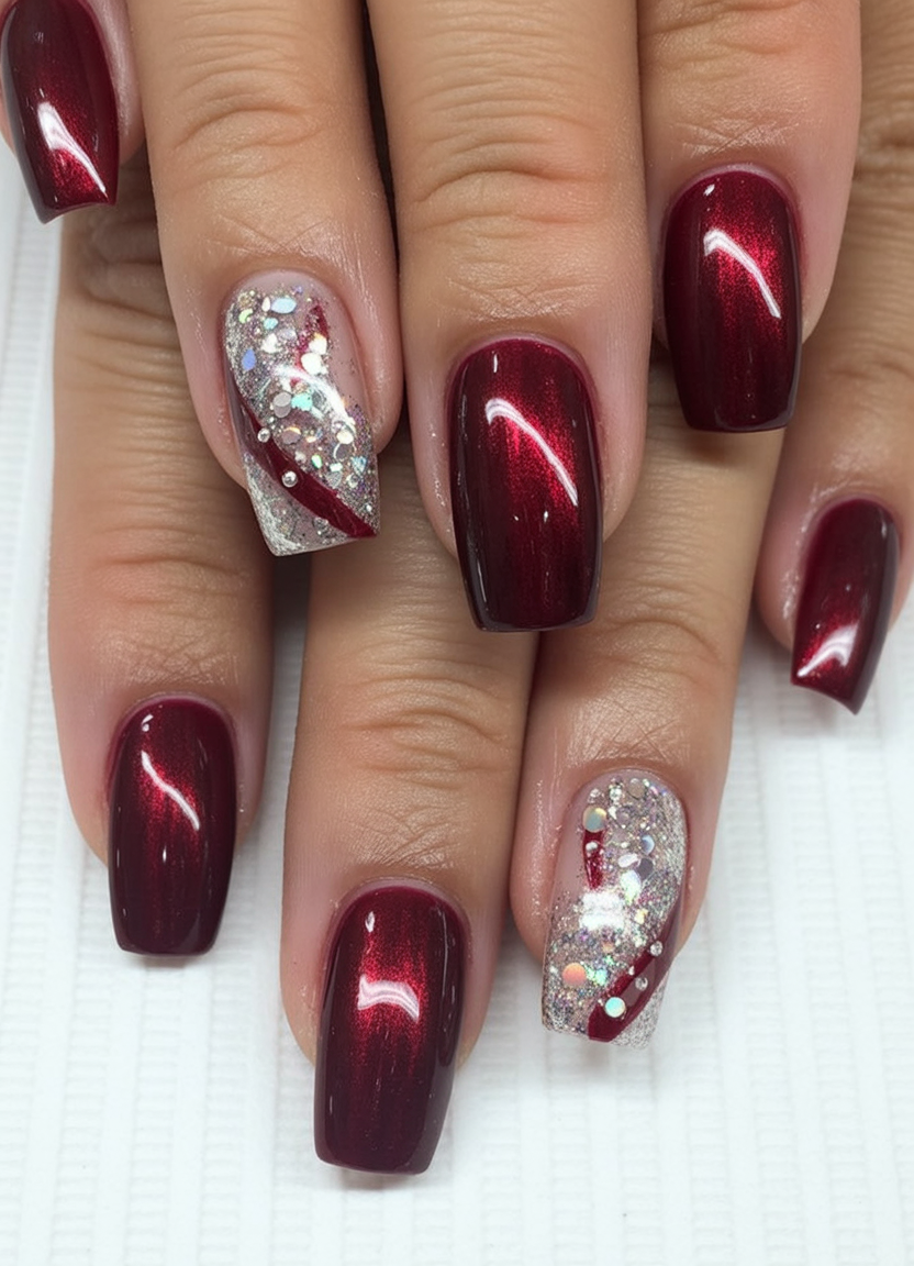 This design combines timeless sophistication with a hint of sparkle. The deep burgundy polish is rich and velvety, while a single glitter accent nail adds the perfect touch of drama. It’s confident, modern, and a little mysterious—like that perfect red lipstick that never fails to make you feel amazing. This look gives off quiet luxury, with just enough glimmer to make it unforgettable. Perfect for medium-length square nails, this idea works beautifully for both daily wear and special nights out. The glossy polish enhances the depth of color, and the glitter brings that festive sparkle without overwhelming the look. Great for cooler seasons, it pairs effortlessly with gold jewelry or a cozy sweater dress—a go-to design for elegant women who love subtle glamour.