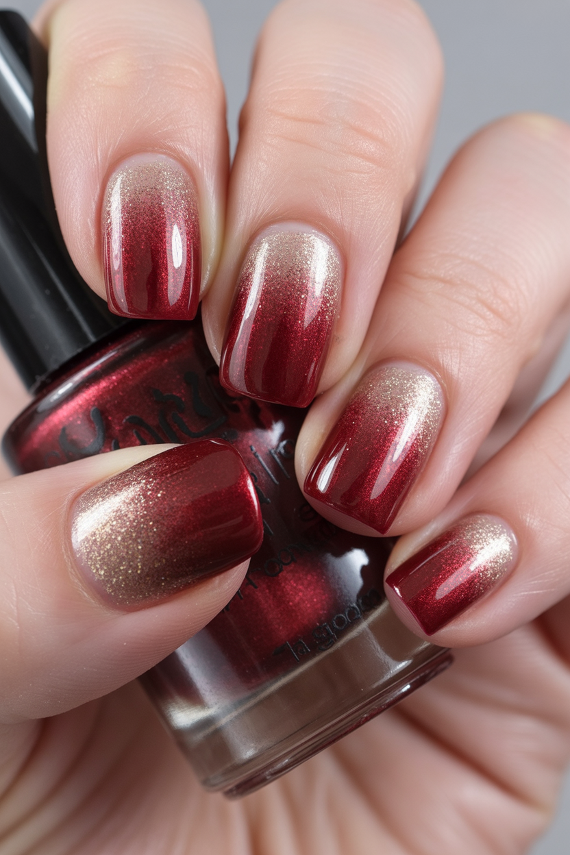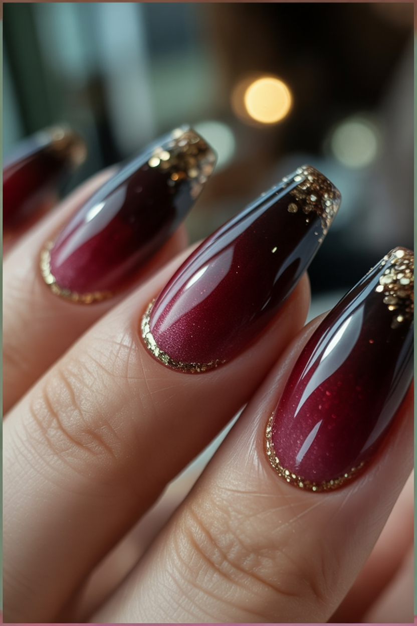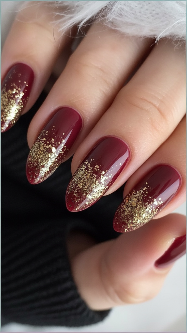 When gold glitter fades into deep burgundy, the result is pure magic—sophisticated, radiant, and endlessly wearable. These with glitter nails look like they’re dusted with starlight, giving off an elegant holiday energy without being overly festive. They’re effortlessly stylish, like that one perfect accessory that pulls your whole look together.