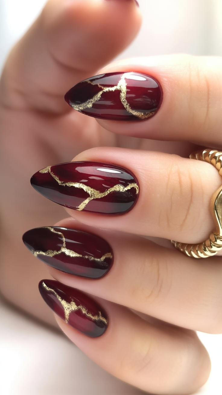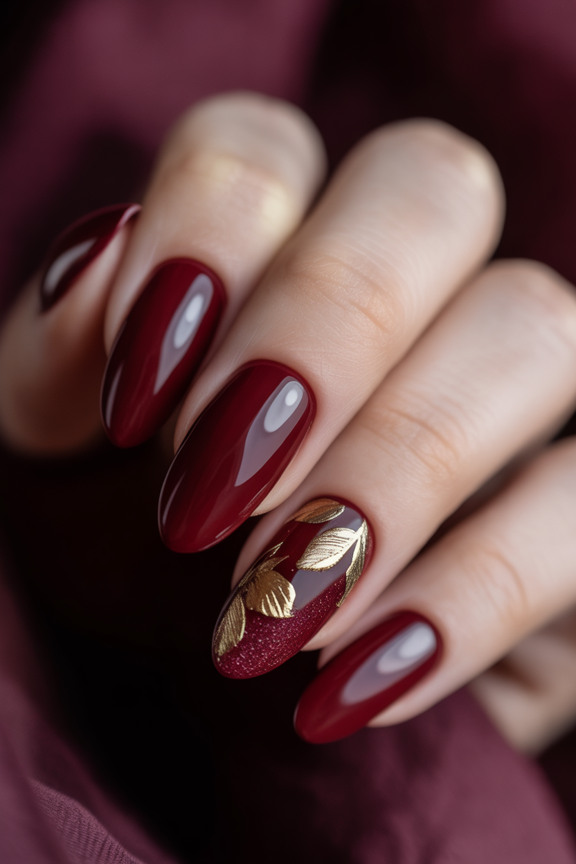 8. Burgundy Almond Nails with Gold Leaf Accent