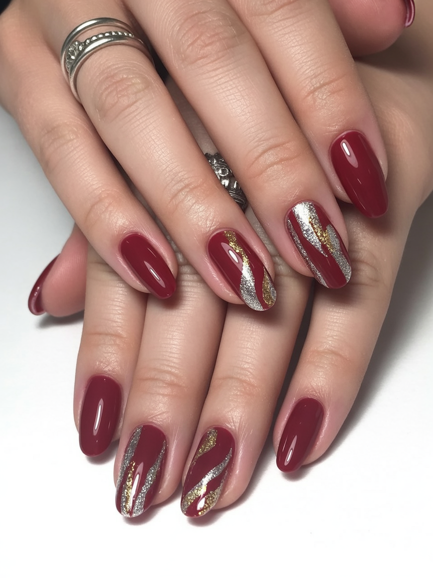 If your vibe is confident but playful, these burgundy nails with glitter gold and silver accents are pure perfection. The flowing metallic lines create movement, like liquid light dancing across a dark surface. It’s glamorous but not fussy—the kind of inspo that elevates your everyday look with just the right amount of shine.