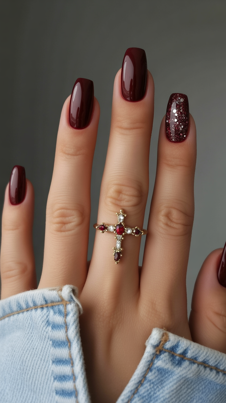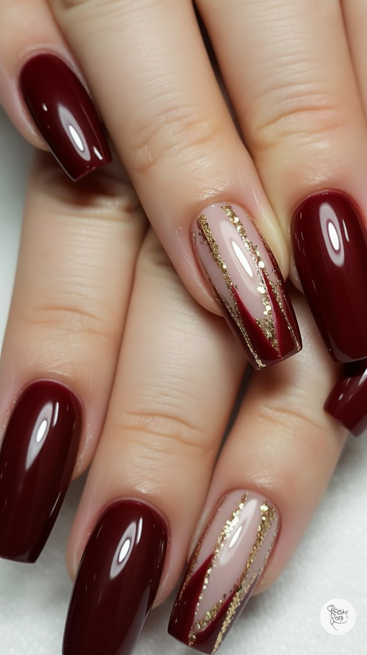 Ideal for professionals or anyone who prefers understated designs and classy touches, this manicure’s strength lies in its balance. The gold glitter detail adds just enough radiance, while the burgundy base keeps everything grounded. It’s timeless elegance with a whisper of rebellion—a perfect mix of polish and personality.