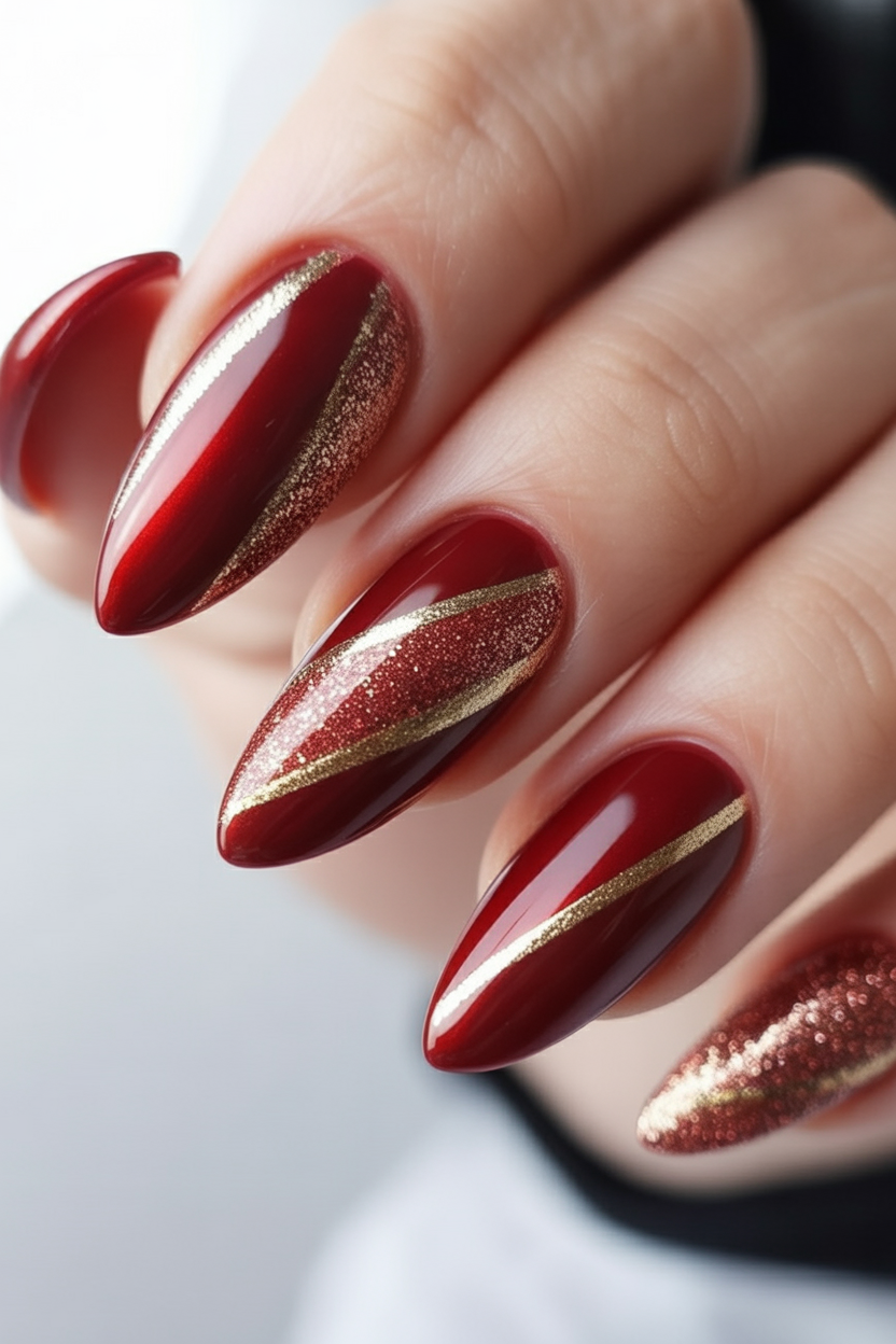 There’s something timeless yet daring about deep burgundy paired with a hint of gold. These almond nails bring that rich, sultry mood to life—like sipping red wine in a velvet dress under candlelight. The diagonal gold lines add just enough sparkle to feel festive without being over-the-top, creating a design that whispers confidence rather than shouting for attention.