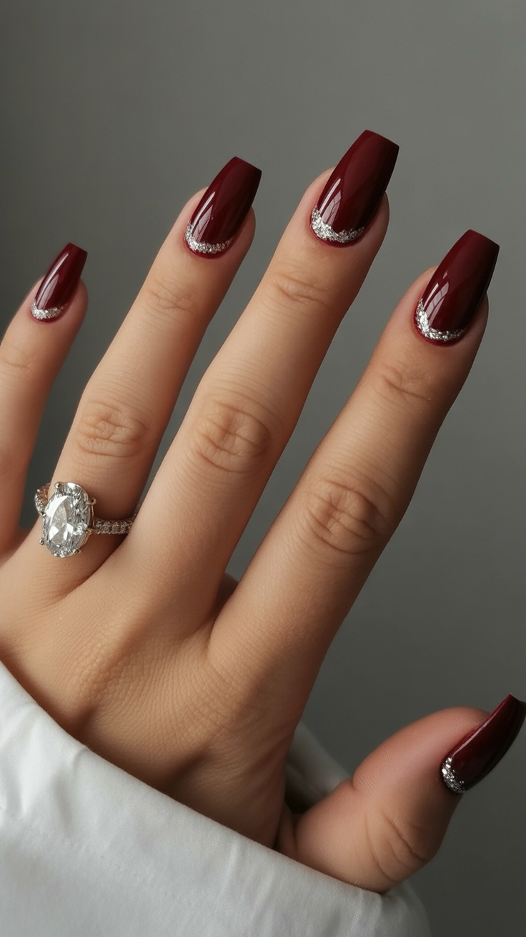 A twist on the French tips concept, these square burgundy nails feature sparkling silver glitter near the cuticles. It’s unexpected, modern, and gives the illusion of jewelry built right into your manicure. The design feels both fresh and festive—ideal for celebrations, dinner dates, or just when you need that little extra shine in your day.