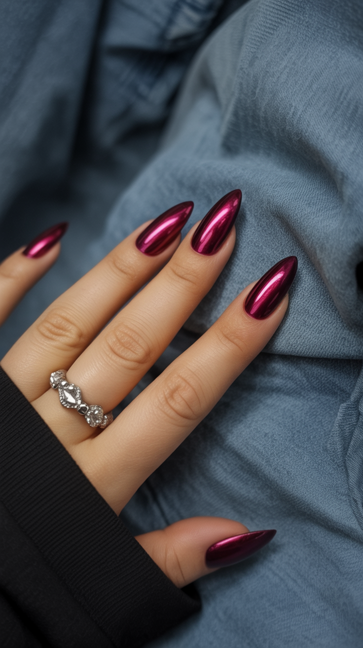 This manicure suits anyone looking for inspo that bridges everyday wear and evening glam. The sleek almond shape keeps it elegant, while the metallic accents catch the light just enough to feel special. Try pairing it with a red lip and silver jewelry for a cohesive, stylish touch that’s simple yet striking.