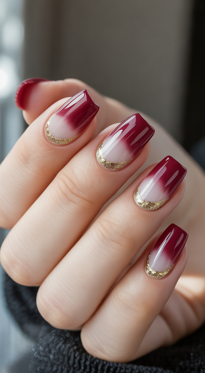 This ombre design is a golden-hour dream—where rich burgundy melts into soft nude and meets a delicate curve of gold glitter. It’s romantic and refined, catching the light with every movement. The transition from dark to light feels modern and polished, perfect for someone who loves elegance with a hint of playfulness. Give it a try in a square or rounded square nail shape for a smooth, elegant look. The gradient pattern is stunning for smaller nail lengths and adds depth to any nail shape. The golden glitter line adds a nice emphasis on the cuticles, making beautiful, manicured hands that catch everyone’s attention. This pattern will look amazing during fall and winter, combined with warm knit clothes and golden accessories.