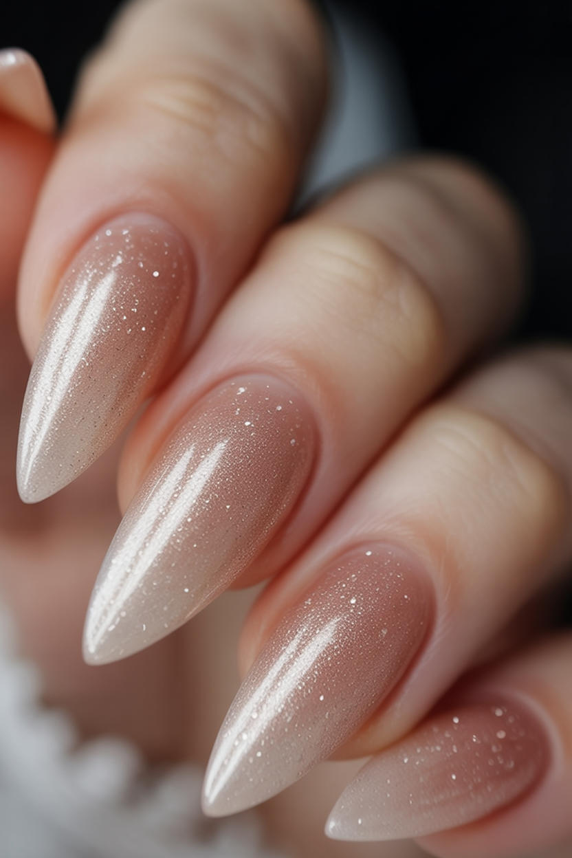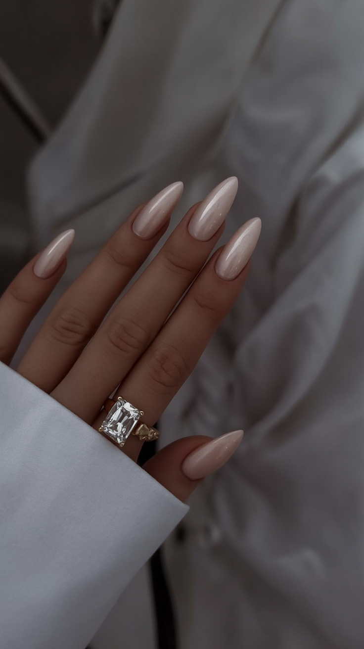 These nails are ideal if you prefer chic nails without striking colors. It decorates hands of medium to longer lengths beautifully and complements mature hands by softly reflecting light. The gentle glow can hide subtle chips, so it is an ideal no-stress choice for everyday use.
