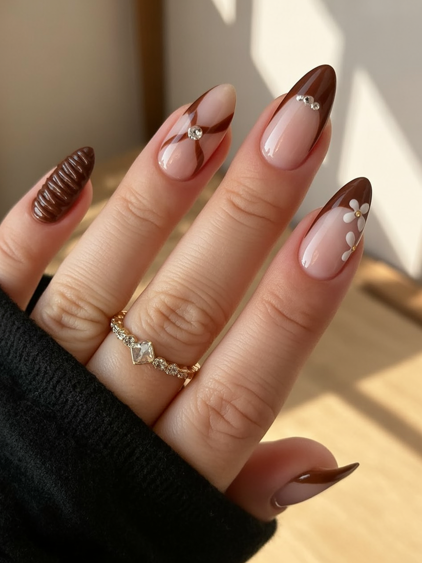 This design gives off all the warm and creative vibes, with an added indulgent feel. The Almond French design has the deep brown tips add richness, and the flower accent adds softness and charm. It’s playful but grounded, perfect for someone who loves detail and doesn’t have to cross into overdone territory.