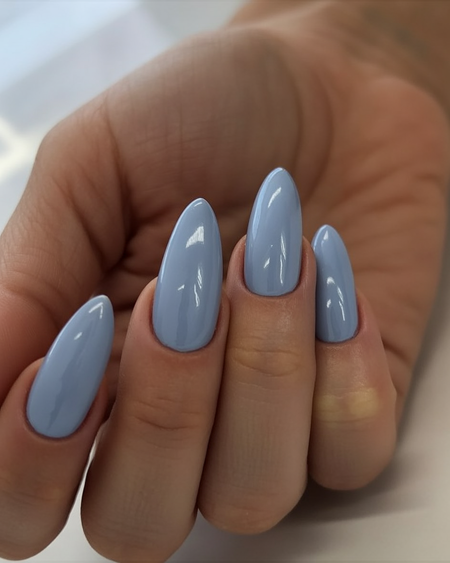 This style is perfect if you want to experiment with colors while keeping things refined. Almond blue shades are especially flattering on medium-length nails and work beautifully across seasons. Pair them with denim, soft knits, or crisp whites for an effortlessly chic finish.
