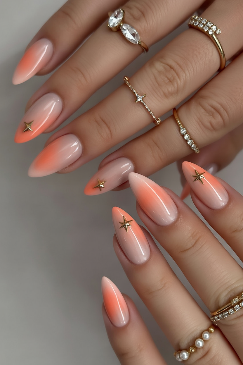 This design feels sophisticated and fun, like when the last bits of sun rays touch your hands. The light peachy ombre melts nicely into the almond shape, and little gold stars give a subtle playful touch. This is a lovely design that is warm and cheerful but does not go to the extreme with trends.