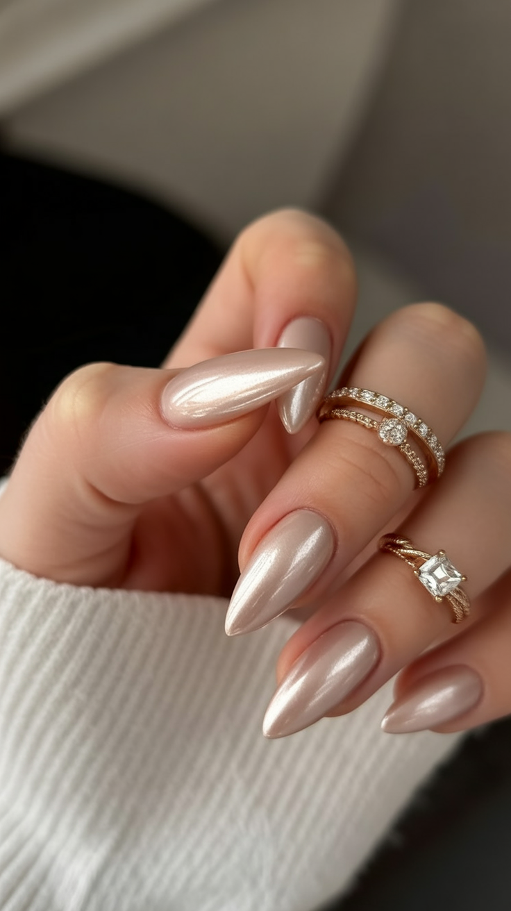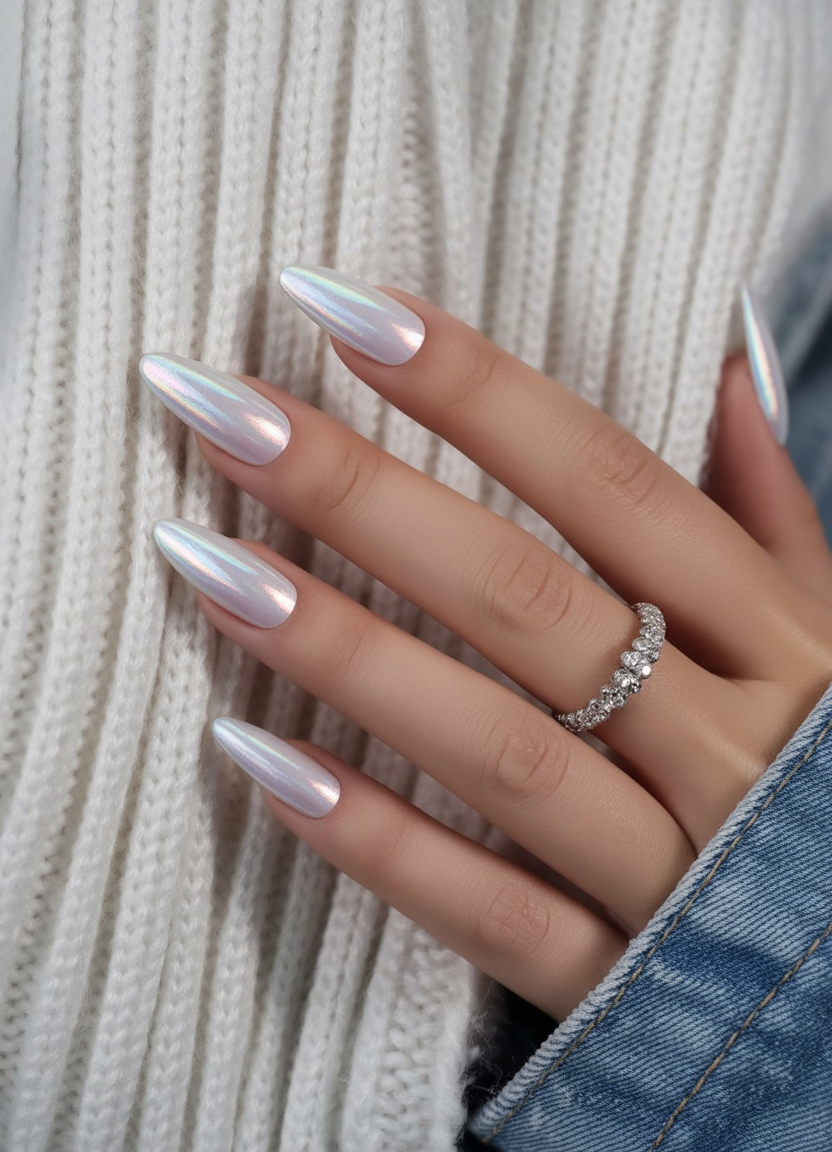 This look taps directly into upcoming trends, where muted metallics and cool-toned colors are taking center stage. Almond nails, like the ones pictured, best suit medium to longer lengths, as it allows the reflective finish to really shine. For an effortlessly updated look, pair with denim, silver jewelry, or crisp whites.