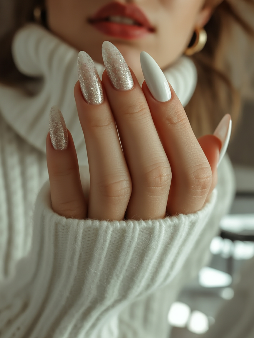 Manicures have always been appreciated for the combination of colors, shapes, and designs that tell a story. With the glowing wave over the glitter, the design uses trendy white almond shapes with a soft glow. This style is complementary to medium-sized nails and goes great with minimalist outfits. This texture is what sets it apart from other, plain, nail looks.