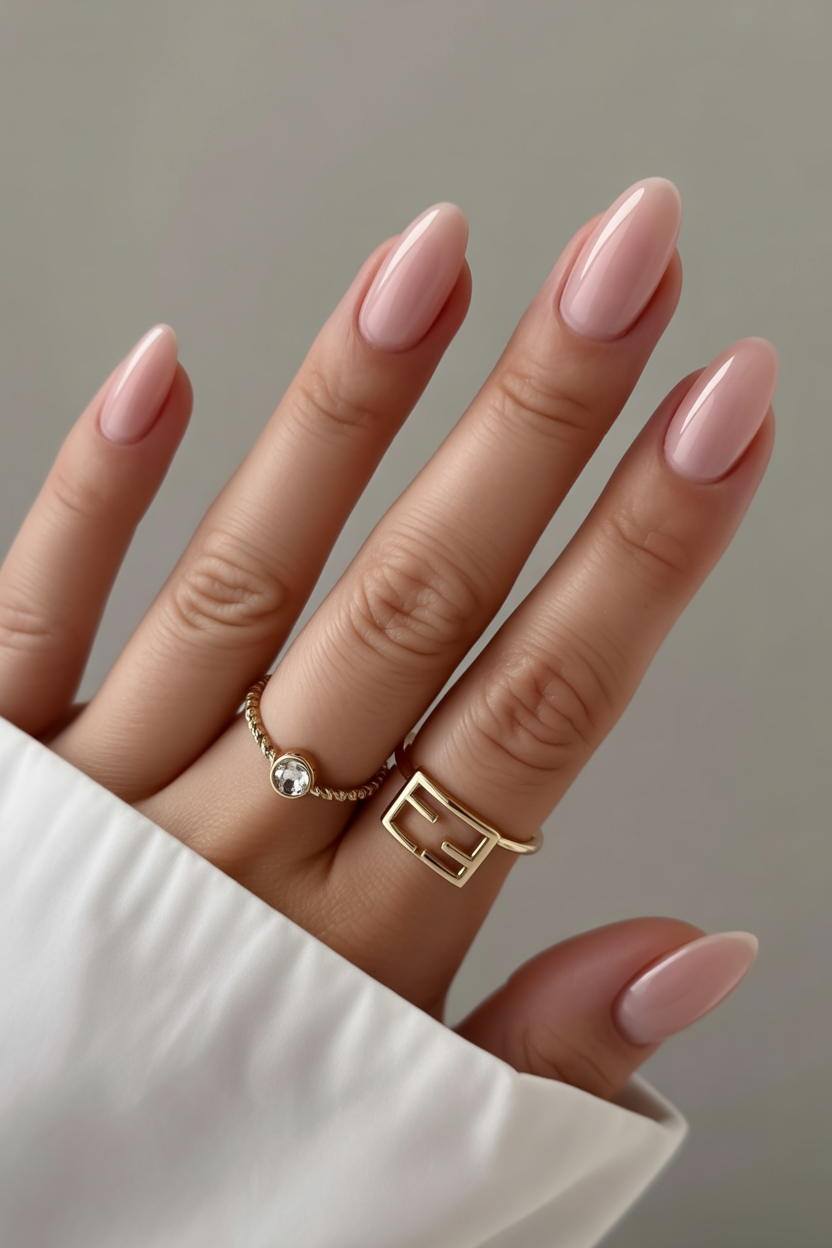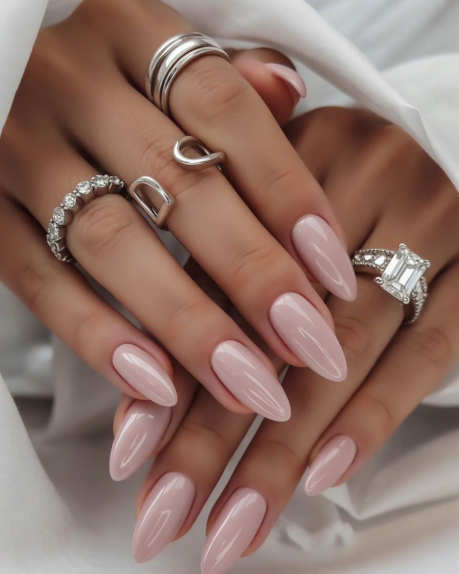 This look is about the clean, modern style that keeps nails looking neat and clean while keeping that polished, glossy, almond-pink look.