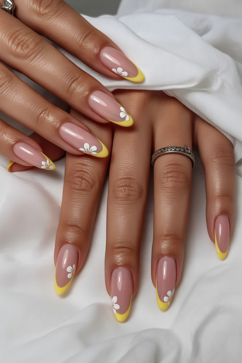This manicure brings instant joy. The warm almond-yellow French tips feel playful and optimistic, while the delicate flower detail keeps everything elegant and grown-up. It’s cheerful without being loud—the kind of design that subtly lifts your mood every time you look down.