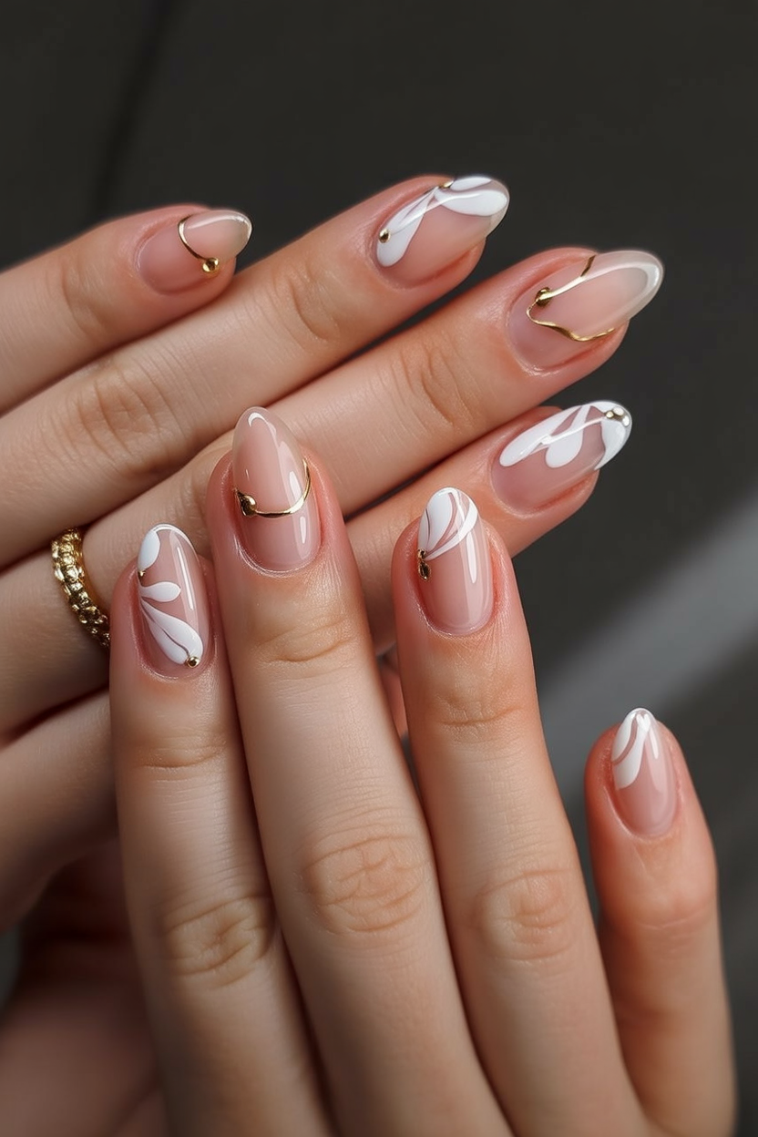 This design is luxury. The white almond base is translucent, and the fine gold accents feel refined and quietly confident. Definitely artistic. Minimal designs, but every detail present and intentional. Perfect for the person who appreciates subtle beauty.